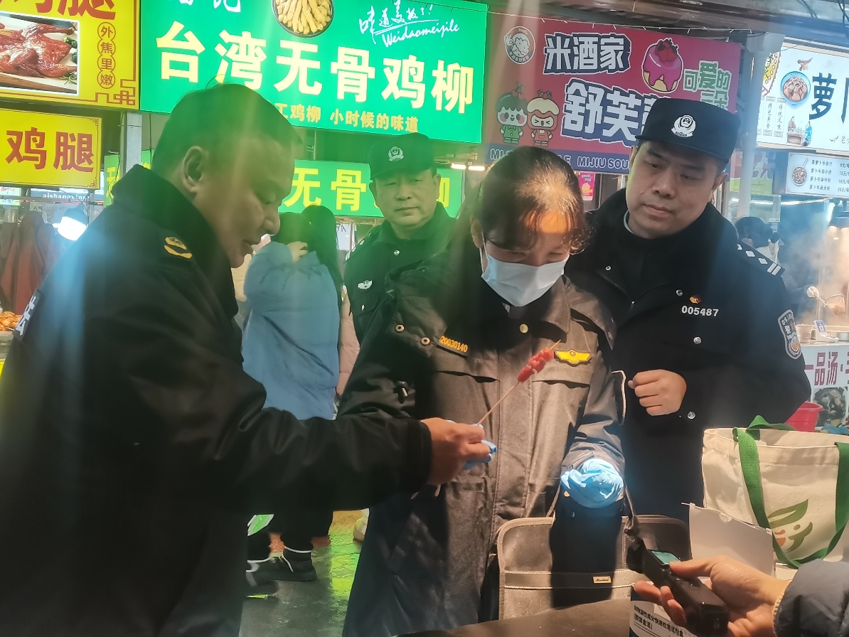 在永安里农贸市场现场拆除违规“生鲜灯”1个,对3家卤肉店“三防”设施不到位、5家牛羊肉销售者索证索票不到位等问题进行责令整改;在万达商圈、株树下夜市,市场监管执法人员对海底捞、渝呈等火锅店及部分摊点在售的鲜肉品、生鸭血等肉制品现场进行动物源性成分快速检测,检测结果均合格。公安执法人员还对夜市抽取的汤底样品进行吗啡、氯胺酮、甲基安非他明等3种常见毒品成分检测,检测结果全部合格。