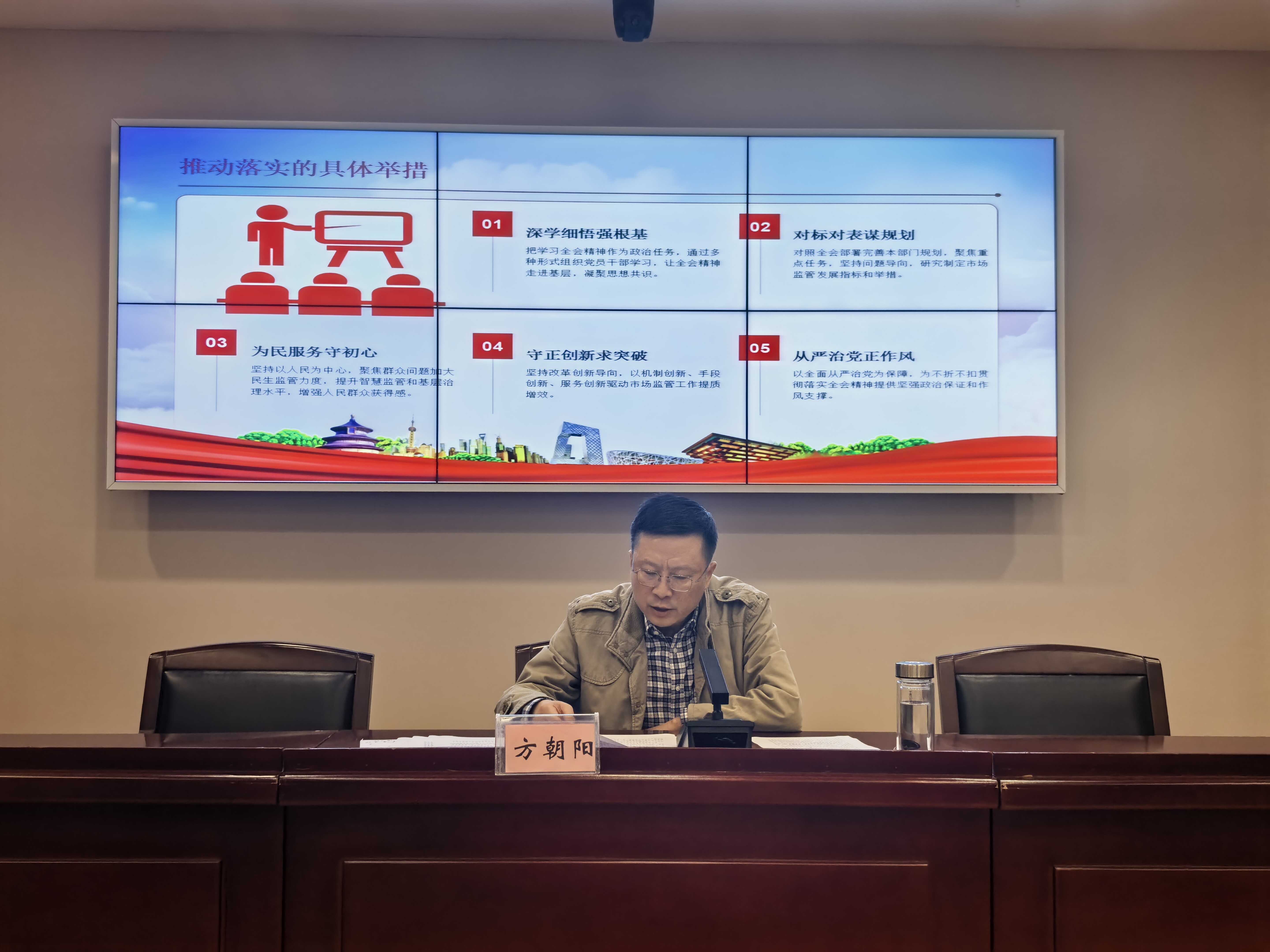 会上,局党组书记、局长方朝阳以《深学笃行党的二十届四中全会精神 奋力谱写“十五五”市场监管新篇章》为题,从提高站位、深刻领会党的二十届四中全会重要意义,深学细悟、精准把握全会的核心要义与精神内涵,笃行实干、将全会精神转化为市场监管奋进力量,知行合一、推动党的二十届四中全会精神见行见效四个方面,对党的二十届四中全会进行了系统宣讲和深入解读,同时,聚焦市场监管主责主业,结合市场监管工作实际,从科学规划引领、深化改革赋能、精准监管护航、守牢底线思维、坚持质量引领五个方面提出实践路径,深化党员干部对全会精神的理解把握,为全市市场监管系统进一步推动发展、强化监管、优化服务、守住底线,提供了有力指导。