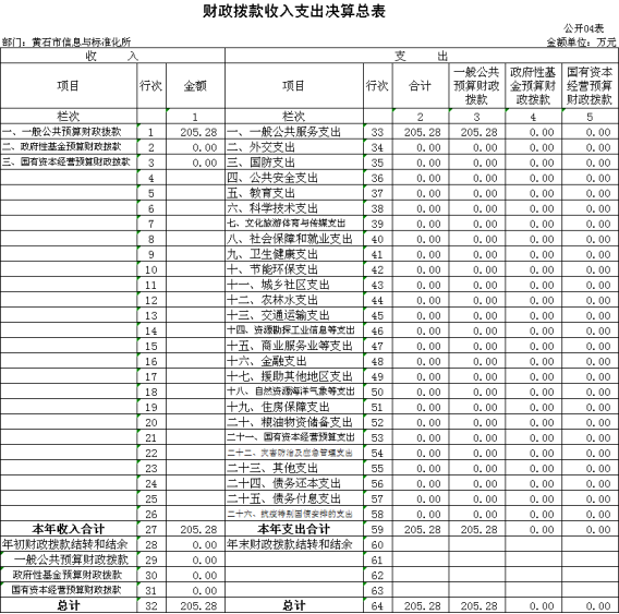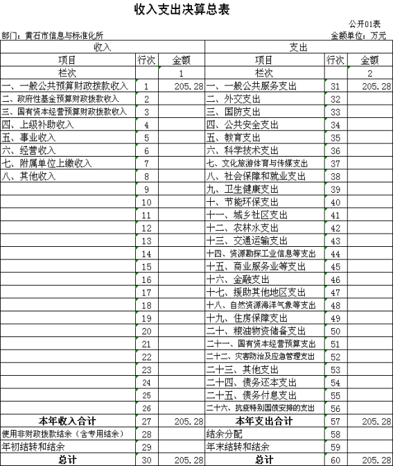 2024年度收、支总计均为205.28万元。与2023年度相比,收、支总计各增加0.41万元,增长0.2 %,主要原因一是今年新招录一名职工,对应人员经费增加10.48万元,二是去年有对标达标和标准研究经费10万元。