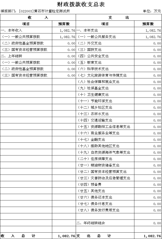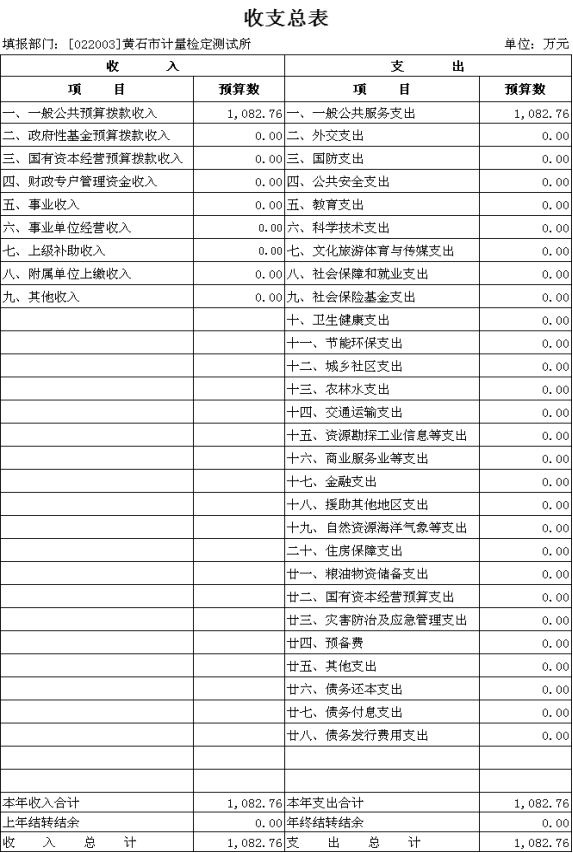 按照综合预算的原则,黄石市计量检定测试所所有收入和支出均纳入部门预算管理。收入包括:一般公共预算拨款收入;支出包括:一般公共服务支出;2026年度收支总预算1082.76万元。