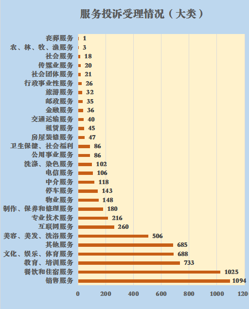 (2)受理餐饮和住宿服务的投诉1025件,占服务类投诉量的15.76%,其中餐饮服务845件,住宿服务180件。投诉反映问题较多的是餐饮店食品内有蟑螂、头发、虫子等异物,食物变质,食材不新鲜等,特别是外卖食品问题尤为突出;入住酒店环境差以及赔损物品收费不合理、预订酒店没有入住,不退押金等纠纷。