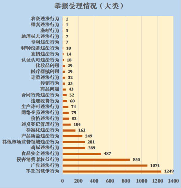 1、受理不正当竞争行为的举报1249件,占举报量的23.46%。举报问题较多的是虚假宣传1050件,网络不正当竞争114件,擅自使用与他人有一定影响的商品名称、包装、装潢等相同或相近的标识64件。