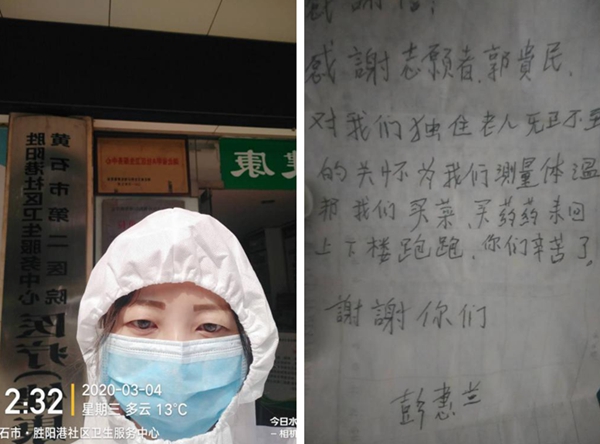 哨口值班值守时,她是认真细致的“检查员”,严格按照社区要求,不漏一人,对进出小区人员测量体温,核实出入证明,并进行登记;包保入户时,她是恪尽职守的“实干者”,为了摸清包保的每一户家庭信息,经常楼上楼下一跑就是3、4个小时,填写的信息登记表被当成模版;解决居民实际困难时,她是体贴入微的“大管家”,登记信息、采买物资、代购药品,尤其对独居老人每天上门嘘寒问暖,及时解决他们的需求,在一次给独居老人代买慢性病药时,其中一种高血压药品,在胜阳港社区服务中心断货且周边药店也无货的情况下,她便向市局药化流通科赵华彦同志求助,经多方联系终于打听到红旗桥卫生服务中心有少量存货,她又与所在社区沟通填表后前往买药,后来,有一位独居老人还专门写来了感谢信;送病人就医时,她是勇往直前的“逆行者”,前往医院意味着更大的感染风险,但她从未退缩,她清楚的明白,不是不畏生死,是责任、使命让她必须向前。为了疫情防控工作,她已经将个人安危置之度外。