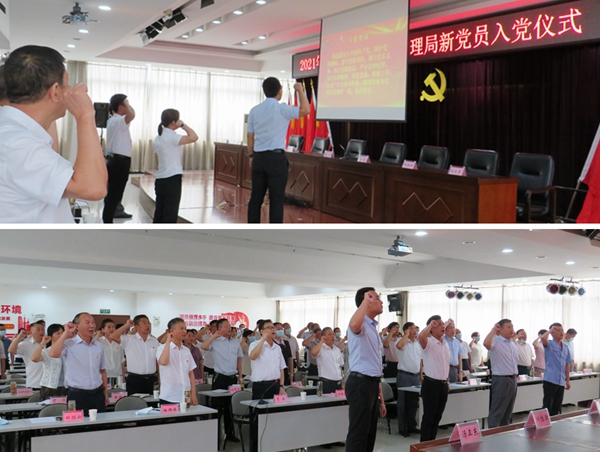 庄严的国歌声中,表彰活动正式拉开序幕。5名新发展党员高举右拳在主席台前进行入党宣誓,老党员全体起立重温入党誓词。