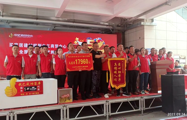 “义卖助学”活动第一期自2022年9月8日起至9月24日止,各建材经营户每成交一笔建材无论赢亏将拿出不低于10元善款作为贫困学生助学金。活动发起以来,60余家商户积极参与,并将15天成交的17960元善款全部捐出。