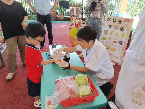 活动现场,港区市场监管局的工作人员使用快检一体机检测食堂采购的蔬菜是否含有农药残留,洁净度检测仪检测餐具和小朋友手掌洁净度,结合小朋友的年龄特点,用浅显易懂的生动语言向孩子们讲解了什么是农药残留、如何辨别食物的好坏、讲解什么是健康食品,引导孩子们养成均衡饮食、远离垃圾食品等良好习惯,培养幼儿从小树立良好饮食卫生习惯。活动现场气氛活跃、寓教于乐,小朋友踊跃互动、收获满满,宣讲活动取得良好效果。
