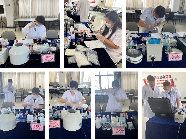 在6月9日的食品安全快检实操竞赛中,每位选手需要在100分钟内完成三个检测项目。现场评委根据选手的实验前准备、穿戴、样品前处理、仪器使用、结果判定、完成时间长短等方面进行评分评比。参赛选手们熟练操作仪器设备,有条不紊地进行检测,仔细分析数据并填写原始记录,每一步都一丝不苟,力求准确,展现出良好的专业技能素养。