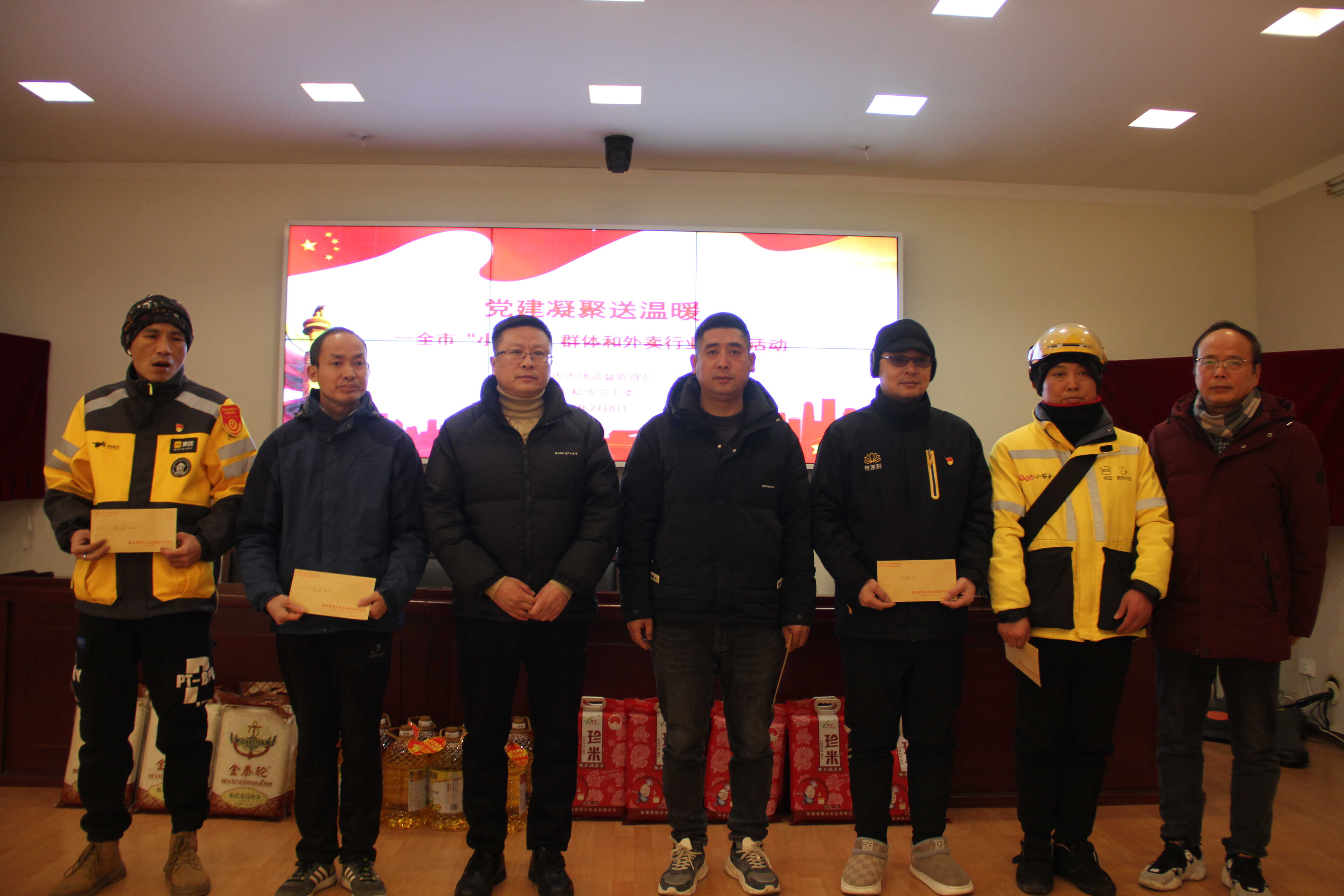 为切实做好“小个专”及外卖行业党建及服务工作,增强党在“小个专”行业和新就业群体中的号召力、凝聚力,更好发挥党员先锋模范作用。2月8日上午,市市场监管局组织开展“党建凝聚送温暖”活动,市市场监管局党组书记、局长,市个私协党工委书记方朝阳,市局党组成员、副局长,市个私协党工委副书记李冰为“小个专”党员、外卖党员骑手及全市优秀外卖骑手发慰问物资和慰问金。本次活动共慰问87人,慰问金和慰问物资总额25000元。