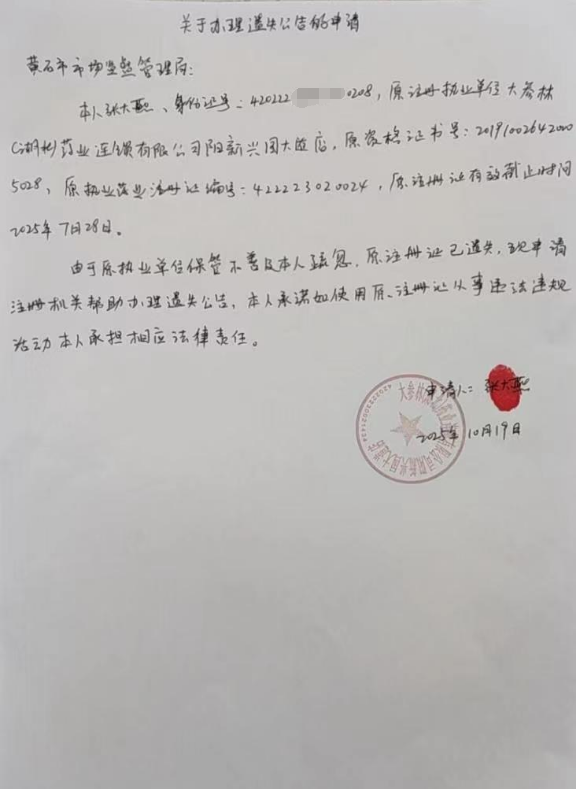 关于执业药师张大燕原注册证(422223020024)的遗失声明