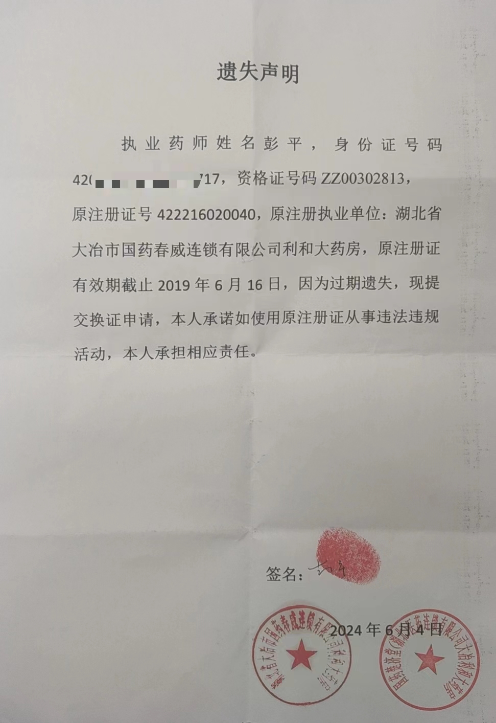 关于执业药师彭平原注册证(422216020040)的遗失声明