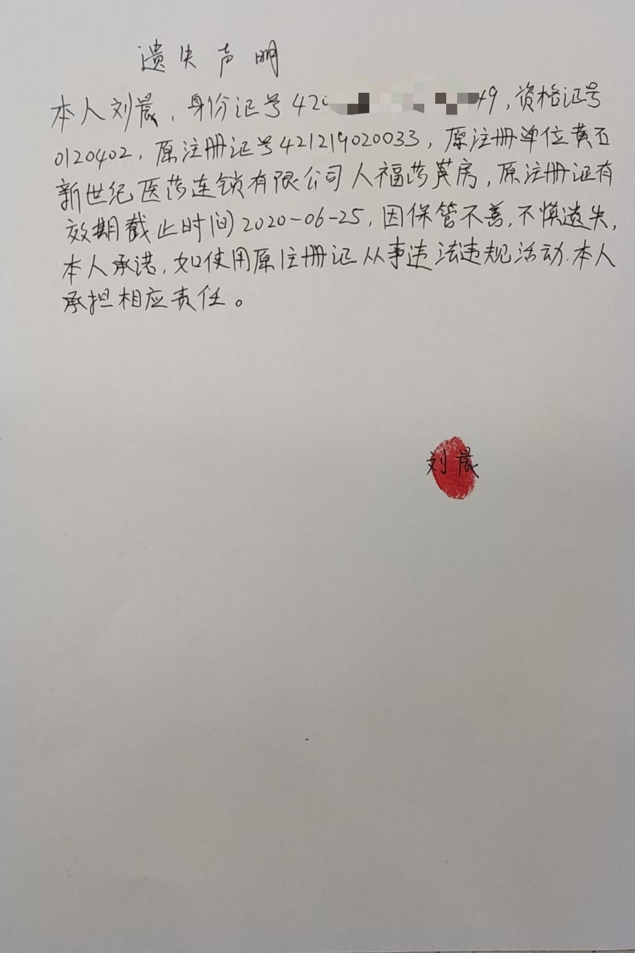 关于执业药师刘晨原注册证(421219020033)的遗失声明